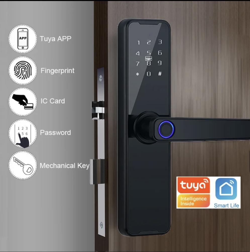 قفل الكتروني ذكي للأبواب الداخلية حديد او خشب او المنيوم يفتح بعدة طرق ( بصمه - رقم سري - بطاقات ممغنطة - وتطبيق الجوال - ومفاتيح يدويه للطوارئ ) يعمل بالبطاريات لا يحتاج لتمديدات تركيبه سهل وعمر البطاريات طويل جوده عالية .